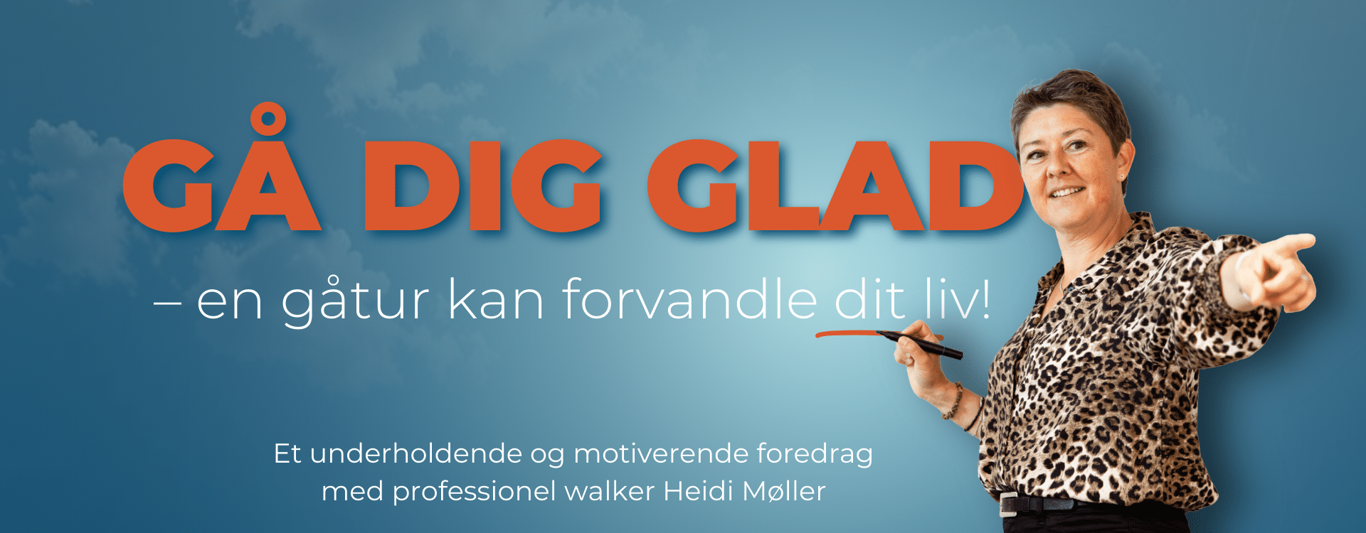 Foredragsholder Heidi Møller (født 1973), professional walker og stifter af ’Gå Mig Glad’. Heidi’s historie spænder fra tidligere serviceassistent med det sorte bælte i buffet –til succes som utraditionel selvstændig. Hun begyndte at gå i maj 2015. Siden da har hun stået på egne ben, hvor omdrejningspunktet har været netværksgåture, konferencegåture, events, workshops og foredrag.